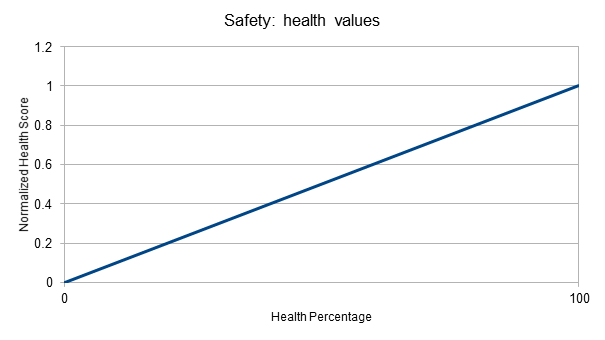 以前面的计算“安全”级别为例,我们决定将健康百分比保持为线性值,即无论是重伤还是轻伤,生命值提高10%都是一样好,因此将其映射到0到1的范围很简单: